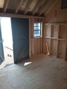 Offset roofline shed with board and batten siding, double doors and two windows on the front
